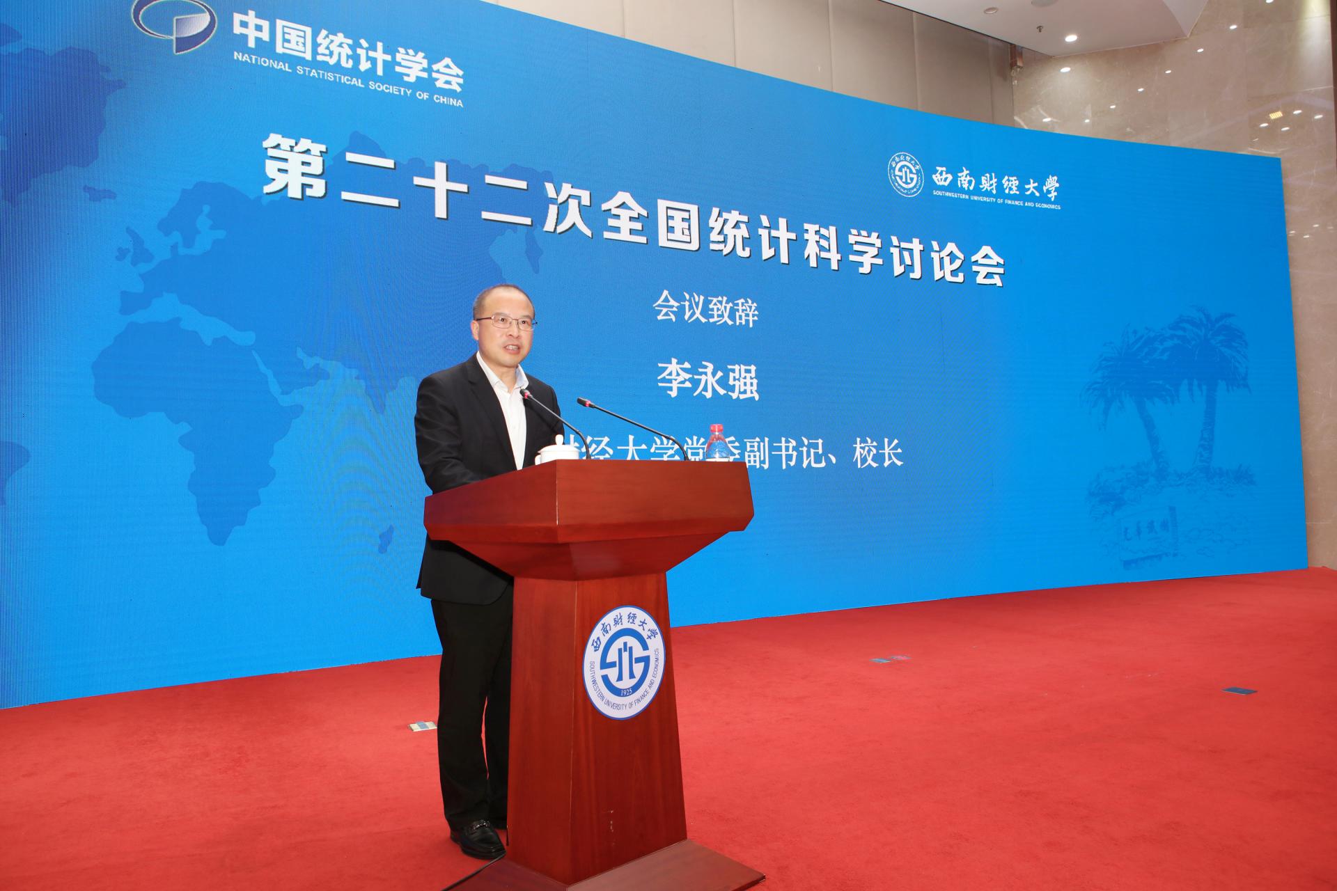 李永强致辞,代表会议承办方西南财经大学热烈欢迎与会嘉宾的到来,他结合学校与国家需求、时代脉搏同频共振的发展历程,重点介绍了近年来深入推进“建设新文科、引领新财经、创造新优势”战略实践,全面推动“新财经”战略升级的战略考量、总体部署与实践成果,他指出学校紧扣统计学科发展前沿和重大需求,形成了以数理统计为基础、经济统计为重点、数据科学为引擎、彰显金融统计优势的学科发展格局,统计学科实力与服务国家经济社会发展的能力不断提升。他表示全国统计科学讨论会是国内统计学者及工作者思想交流、智慧交融的重要平台,期待与会专家在交流研讨中展现我国统计学界的最新理论研究成果和实践经验。服务中国式现代化是统计的职责所系,西南财经大学期待与统计政产学研各界同题共答,为服务“国之大者”贡献统计之力,以“强国建设、统计有为”的使命担当服务中国式现代化。