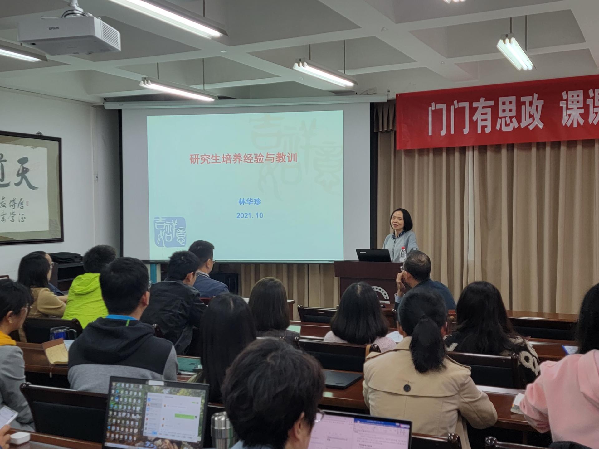 在通博楼B212会议室举办“师德大讲堂”活动,邀请四川省教书育人名师林华珍教授作《如何成为一名优秀的研究生导师》专题讲座。分党委书记黄海波主持讲座。