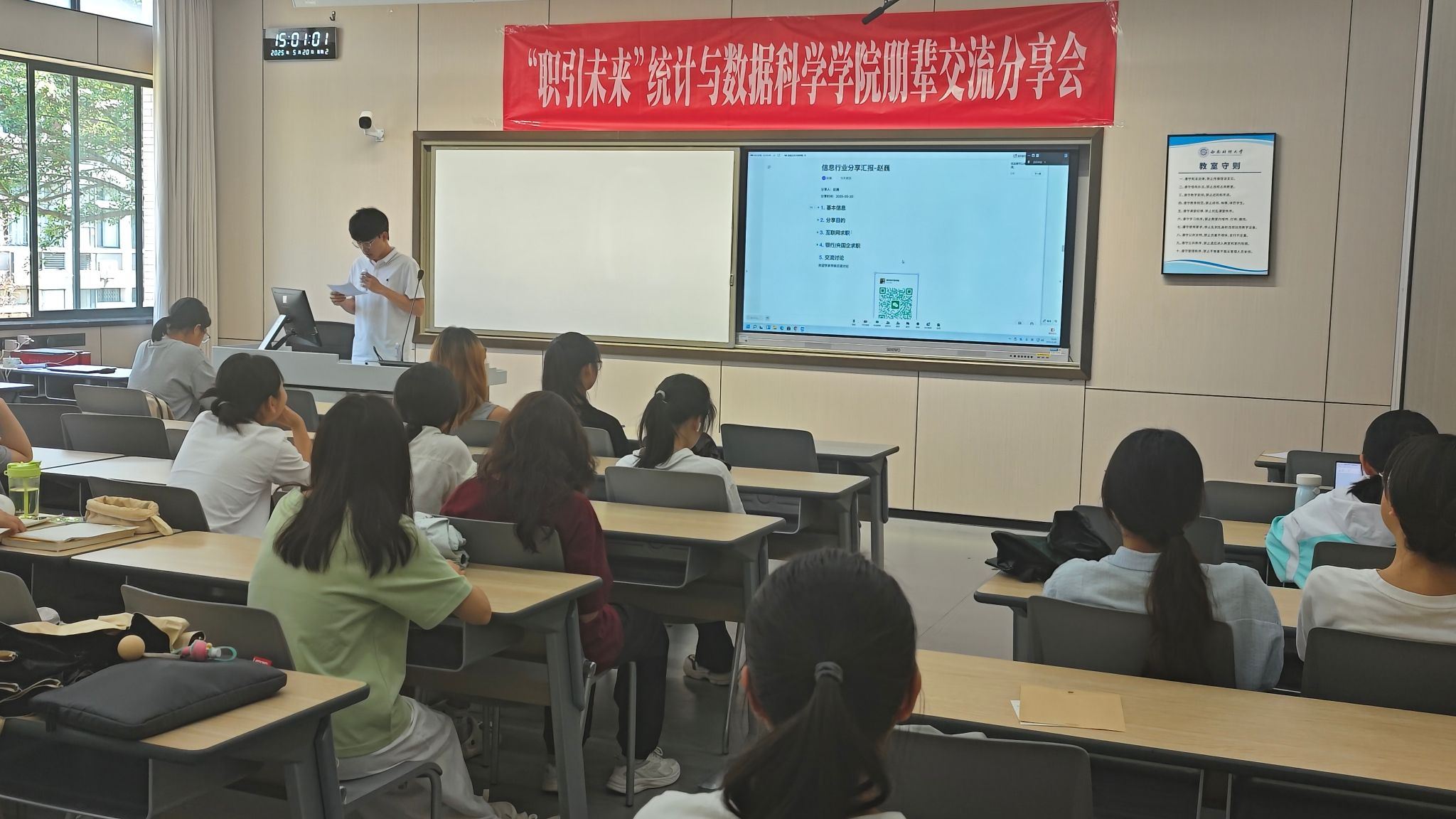 于经世楼C208举办“职引未来”信息技术行业就业朋辈分享会。本次活动特邀两位具备丰富求职经验的硕士毕业生,带来兼具深度与实用性的就业指导。